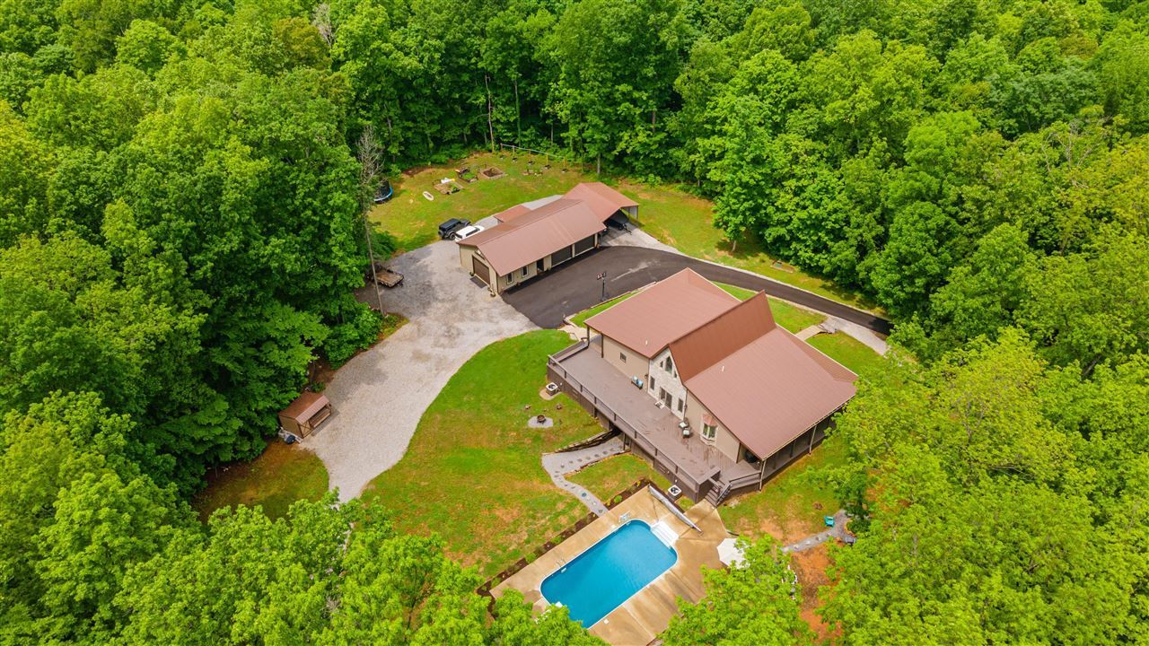 Seller says GET THIS SOLD. 100k price reduction from listing in 2024, plus additions like beautiful Amish-built cabin in the woods & 6-person barrel sauna. This incredible home sits on 30+/- acres of gorgeous countryside. Inside this spacious home of over 3500 sqft, you'll find hardwood floors, cathedral ceilings, a modern kitchen with custom concrete countertops, a cozy loft, an incredible master suite with his-&-hers walk-in closets, & a finished walk-out basement. House is 3 BR & 2-1/2 BA plus the extra room in the finished basement that could be a 4th along with the loft that could also be used as a sleeping area. Outside, the wraparound porch & large deck look out over your stunning in-ground heated pool, detached 4-car garage & workshop, & tons of cut trails through the acreage that lead to the 2 tranquil seasonal creeks running through property. Large chicken coop with electric fenced-in area & raised garden beds, organic Concord grape vineyard, berry orchard with blueberries, blackberries, elderberries, as well as organic herb garden & peach & apple trees. Beautiful new blacktop driveway in 2023, with private gated entrance that winds up to the house & garage with matching RV cover. Huge parking area for large parties and/or a business. Newer landscape with firepit and walk-out entrance from finished basement to the pool. Barely used elevated deer blind & deer feeder will remain for those who enjoy hunting with plentiful deer and turkey. Hike to the treehouse platform on your way to the back creek and don't forget your morel mushroom bag that are plentiful in the spring! This place is a homesteaders/hunters/nature lovers dream! Newer back deck along with recent double HVAC and furnace systems (2023). New heavy duty custom remote controlled fans (2026). Four year old washer/dryer will stay and gorgeous custom master shower along with new dishwasher (2026). This home lacks nothing! Last but not least, a beautiful custom-built Amish-made log cabin with own driveway & parking area. Cabin can be totally off grid with generator (negotiable) along with installed wood burning stove, propane wall heater and kitchen stove, fridge, wall mounted flatscreen TV, outdoor heated shower & custom deck. The list goes on! A lot of upgrades were put into this place! This is a one of a kind property in Halfway, less than 15 minutes from Bowling Green and 50 minutes from downtown Nashville. This kind of property is rarely available and won't last long! Bring us an offer!